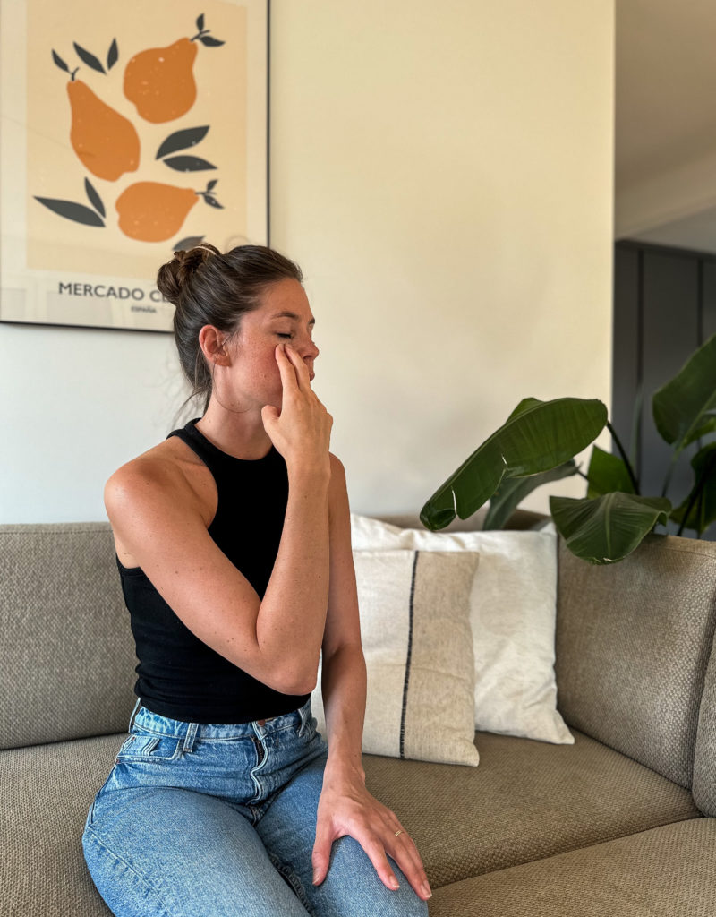 Ensuite vient la séquence de tapotement. Utilisez le bout de deux doigts pour tapoter doucement sur des points spécifiques correspondant aux points d’entrée et de sortie des méridiens de la médecine chinoise. Ces points comprennent le sommet de la tête, le début du sourcil, le coin de l’oeil, sous l’oeil, sous le nez, le menton, la clavicule et sous le bras. Pendant le tapotement, répétez à voix haute « cette anxiété ».